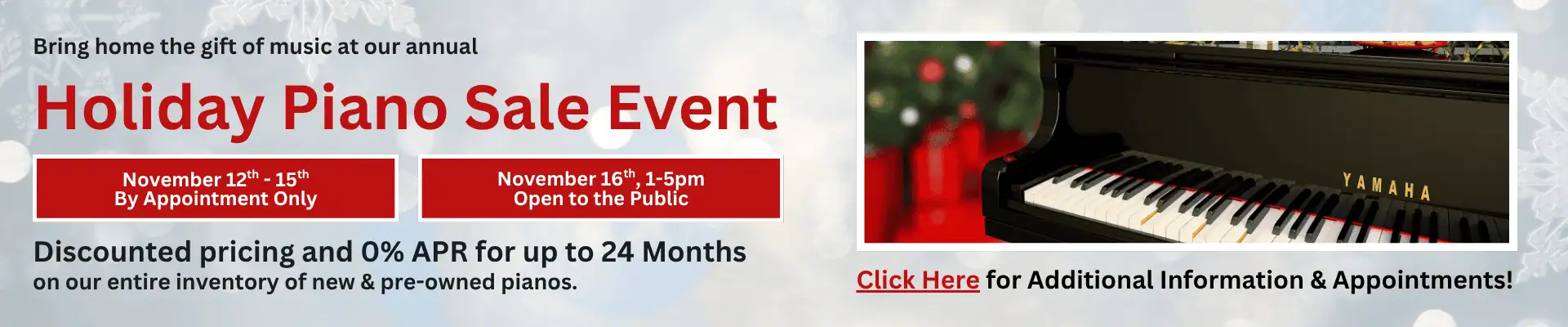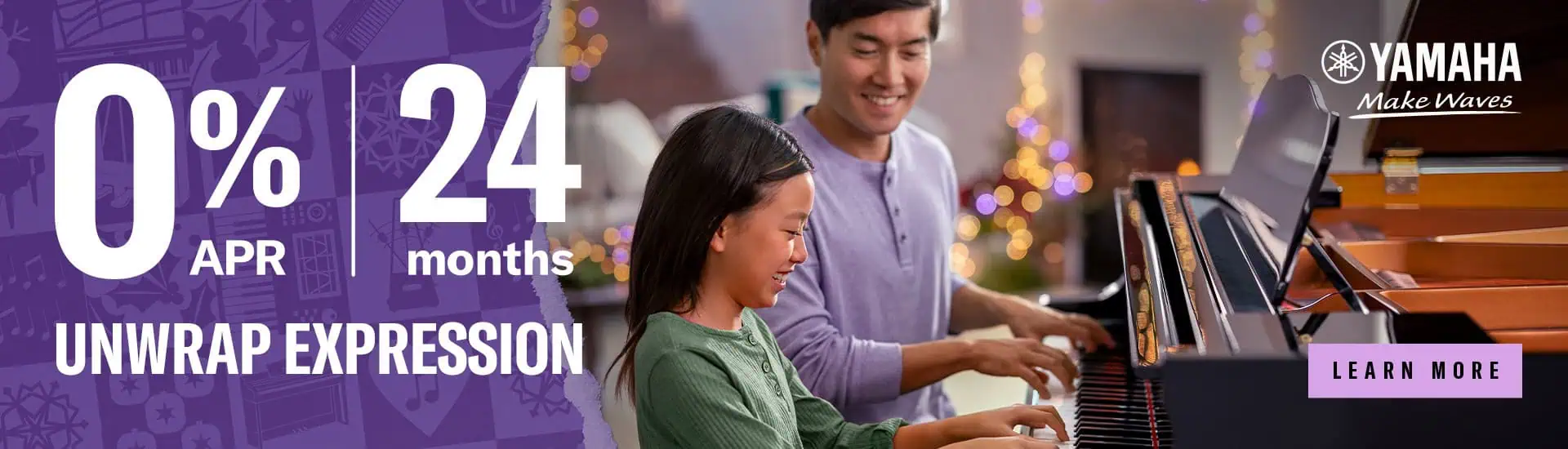 *Subject to credit approval. 24 monthly payments of $41.67 per $1,000 financed at 0.00% APR. On purchases of new and in-stock qualifying Yamaha pianos from October 30, 2025 to January 5, 2026.