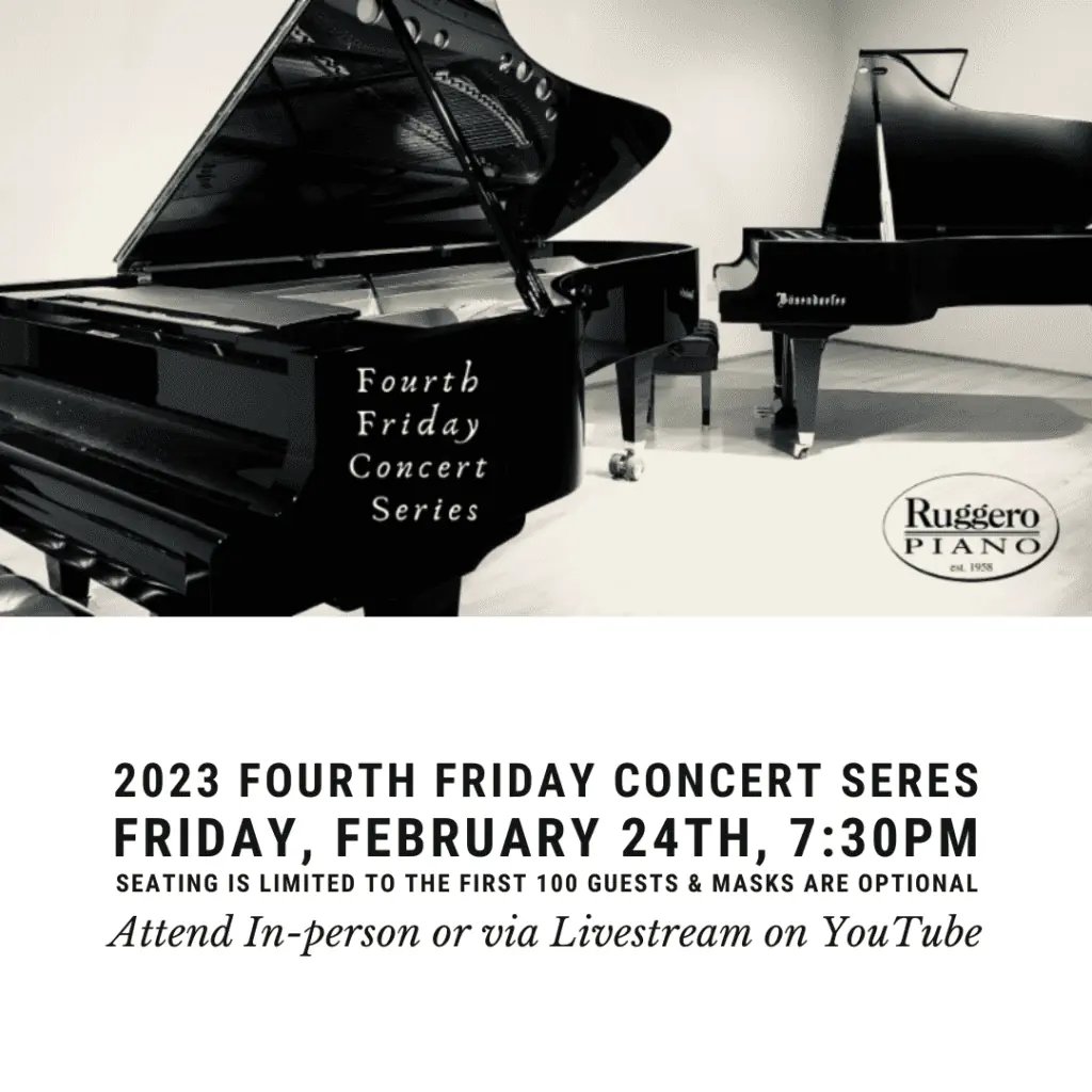 We are excited to host the 2023 Fourth Friday Concert Series. Masks are optional and seating is limited to the first 100 guests on a first-come, first-served basis. This concert series will be available to attend via live stream on our YouTube channel and a link to each concert will be available on the home page of our website, www.ruggeropiano.com. Please contact our office at 919-839-2040 with any questions!